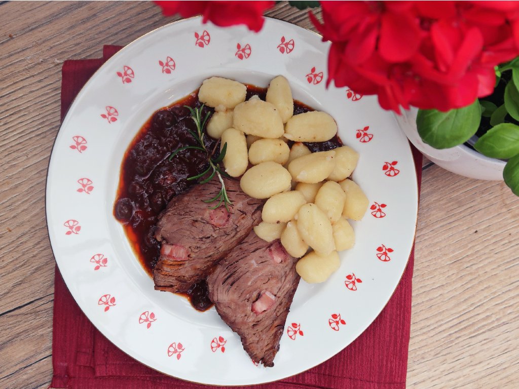 3. Po dokončení vaření vyjměte bylinky, maso nakrájejte na plátky a podávejte s noky, bramborovou kaší či těstovinami.
